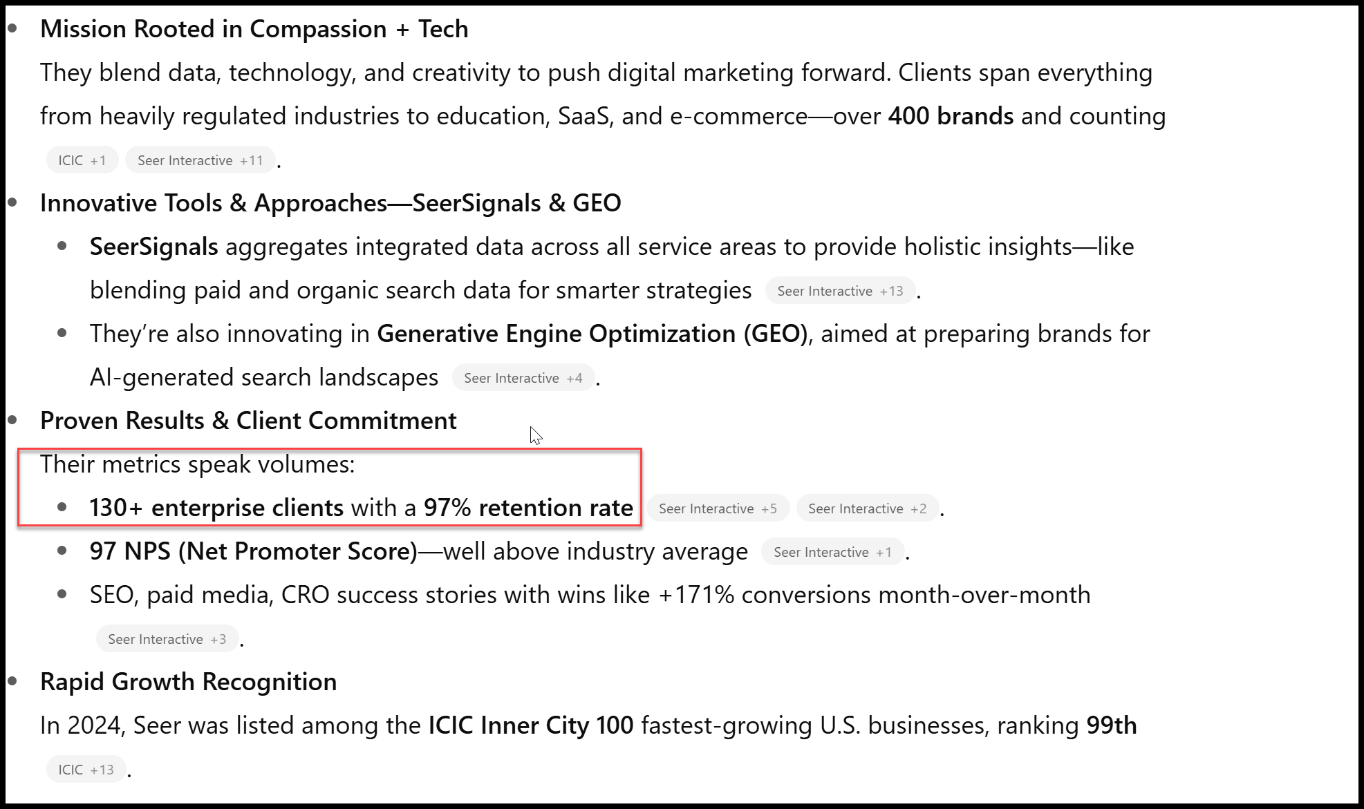 We've been analyzing the prompt "tell me about Seer Interactive" for probably almost 2 years. One of our co-workers Nick Haigler an AIO/GEO researcher at Seer recently noticed that a lot of models would reference "remote first" and when he looked into it...
