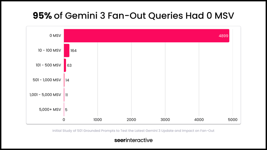 95% of the queries Gemini generated for query fan-outs had 0 global search volume. While this doesn’t necessarily mean they have 0 demand, it does show how niche the queries are, which lines up with how detailed we found the long-tail queries to be in the previous section.