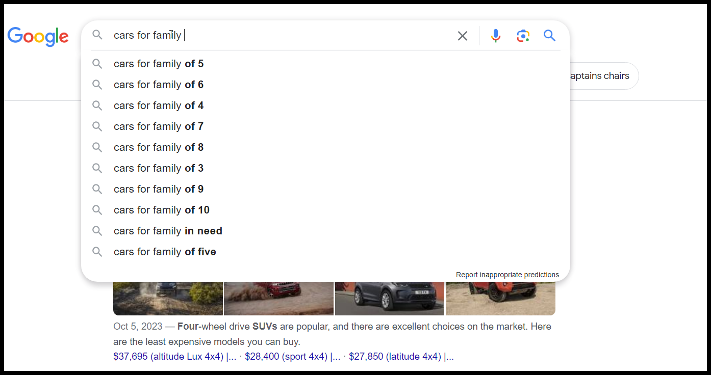 The Google autocomplete shows that people search in a lot of unique ways for a car, and we all have needs unique to our situation, these “with” suggestions give context, but look at all the other “context / role clues left behind, meaning we got some content building work to do, maybe.