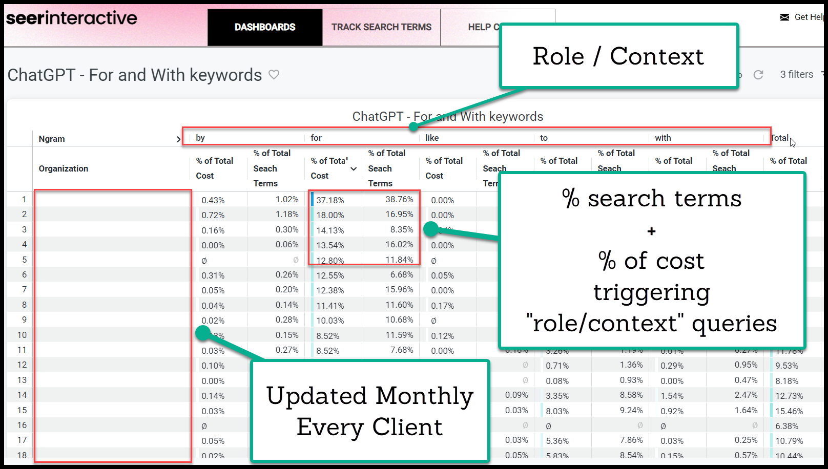 1 - Get context & role clues - Gather all your for and with keywords, what % of your cost, conversions, and total search terms contain them across all clients.